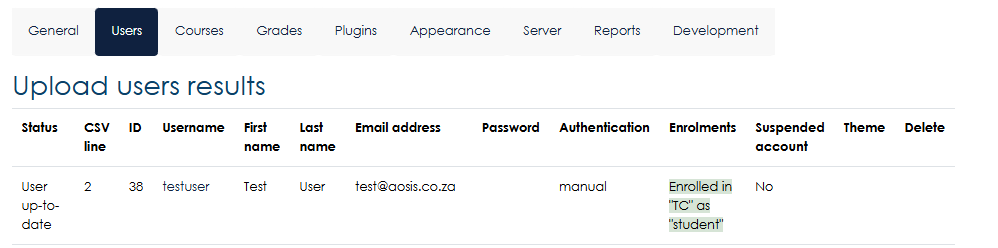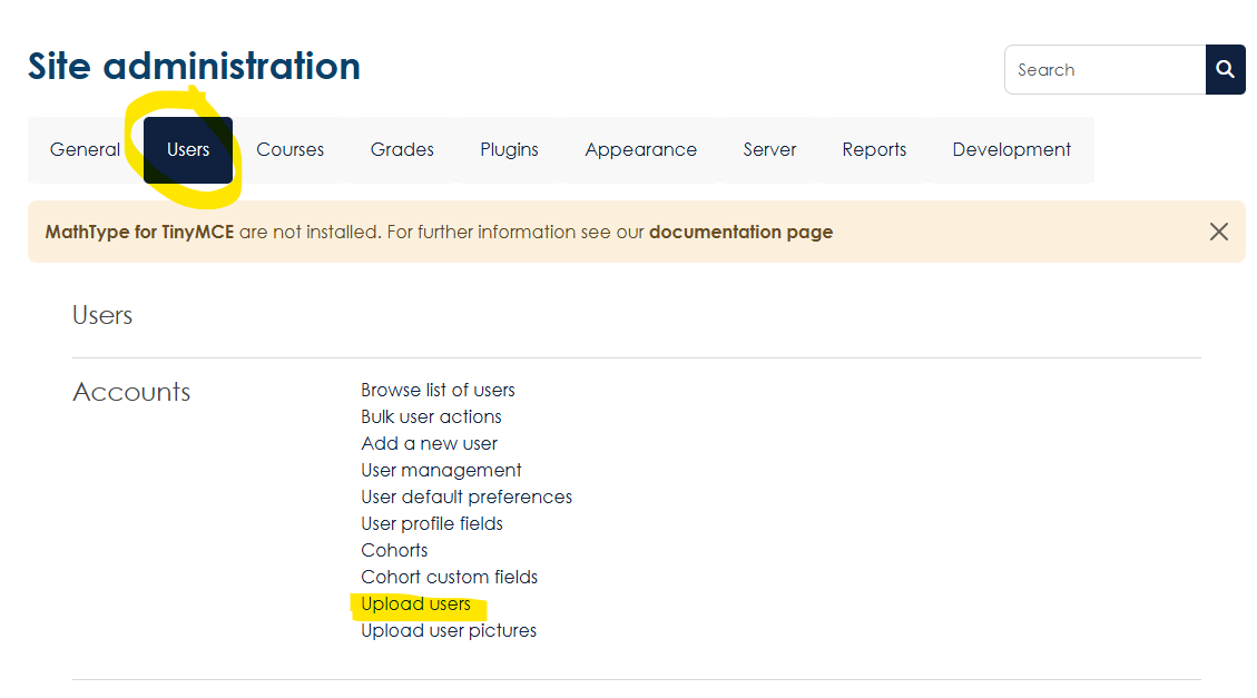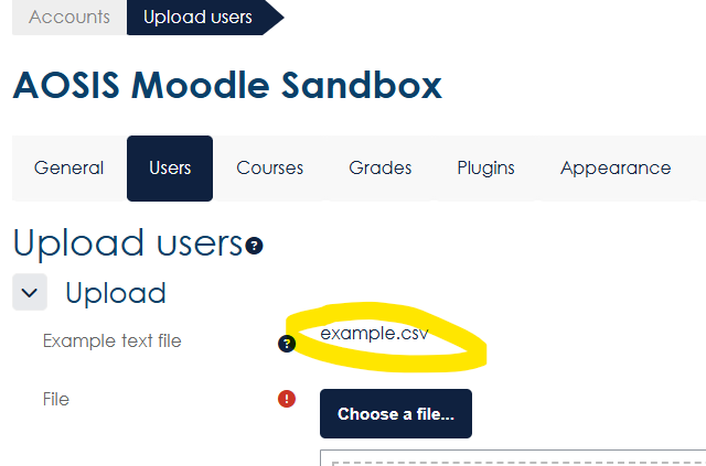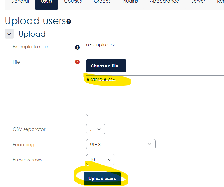 - Under the site administration, click users, then upload users.