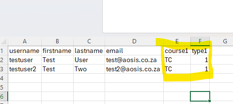 - Add the fields course1, type1 to your excel and add the course shortname in there and use 1 (1 = student. 2 - teacher. 3 = non editing teacher by default). You can add more courses like course2 type2 course3 type3.