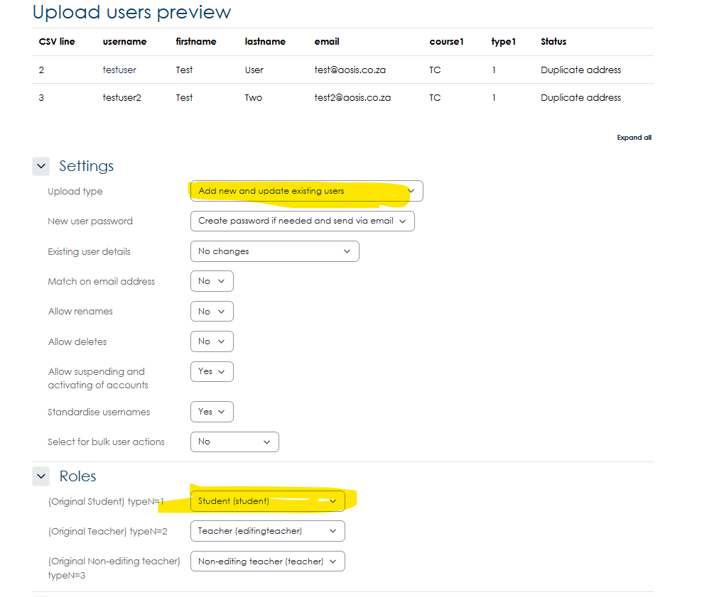 - Change the setting to Add or update existing users, and check that role1 is a student.